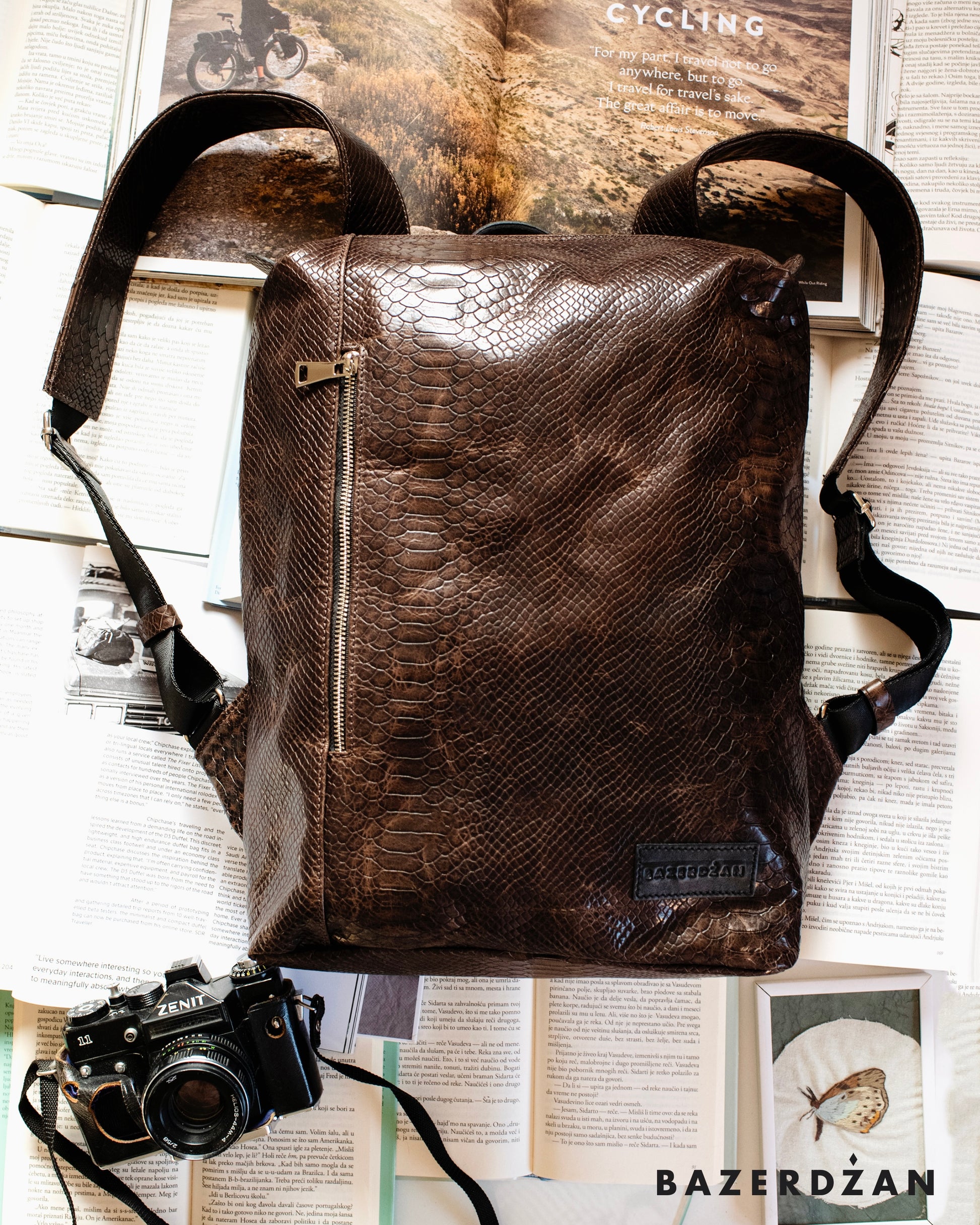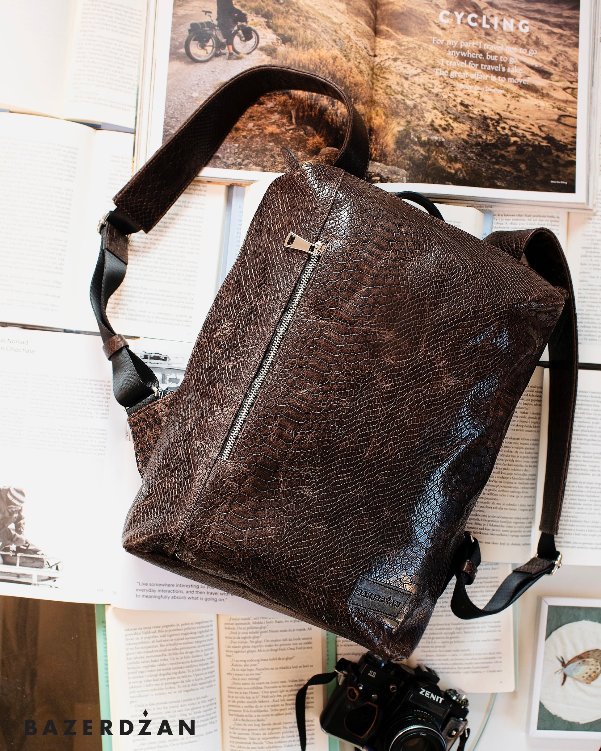 Leather backpack with two extra zips, one in the front and one in the back.