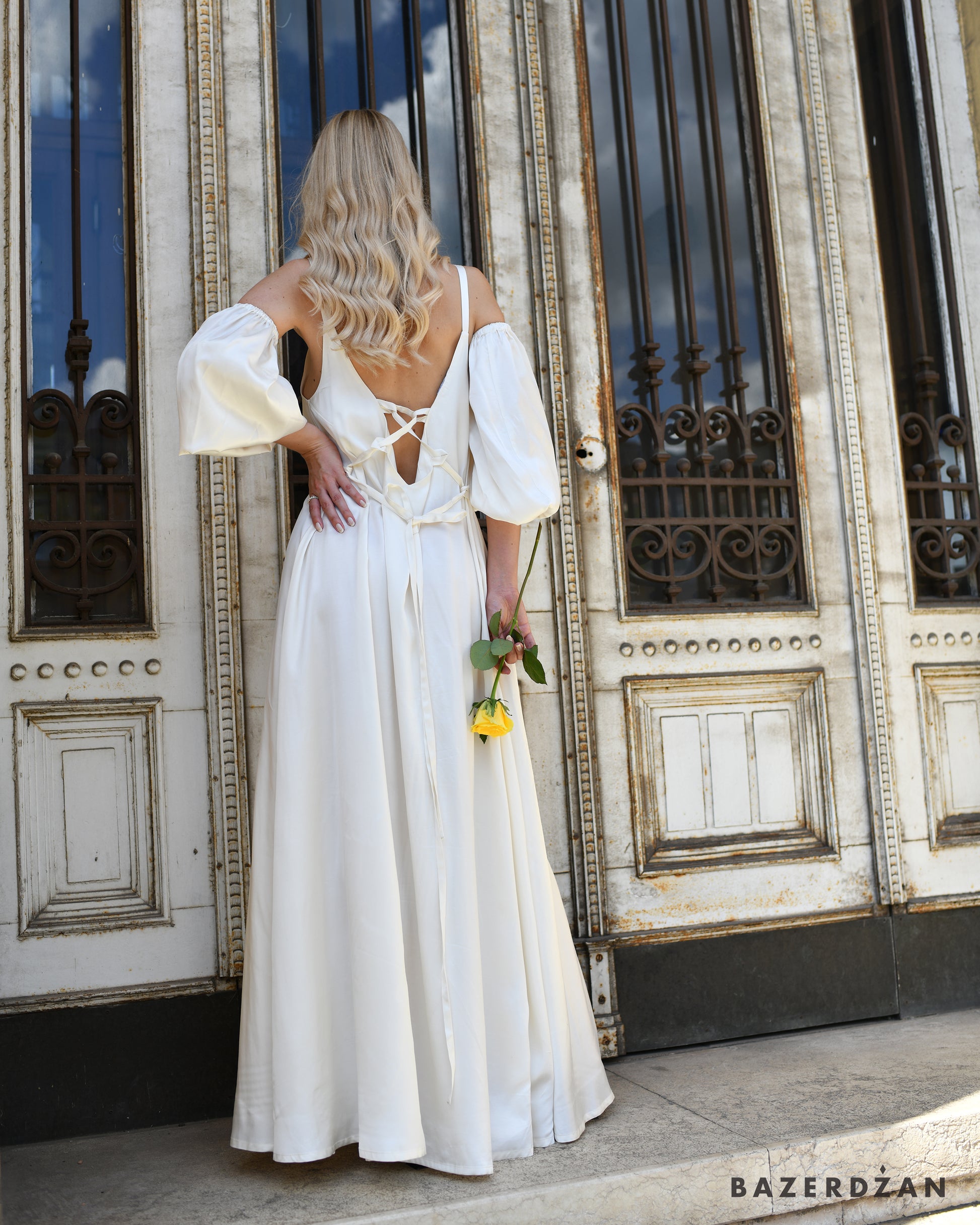 Discover the allure of our long, elegant white dress, crafted from luxurious satin. This exquisite gown features delicate tie straps at the back, allowing you to adjust the fit for a perfectly contoured silhouette. The dress includes sleeves that attach seamlessly from the underarm and extend along the length of the arm, available in both smaller and larger sizes to ensure the perfect fit.